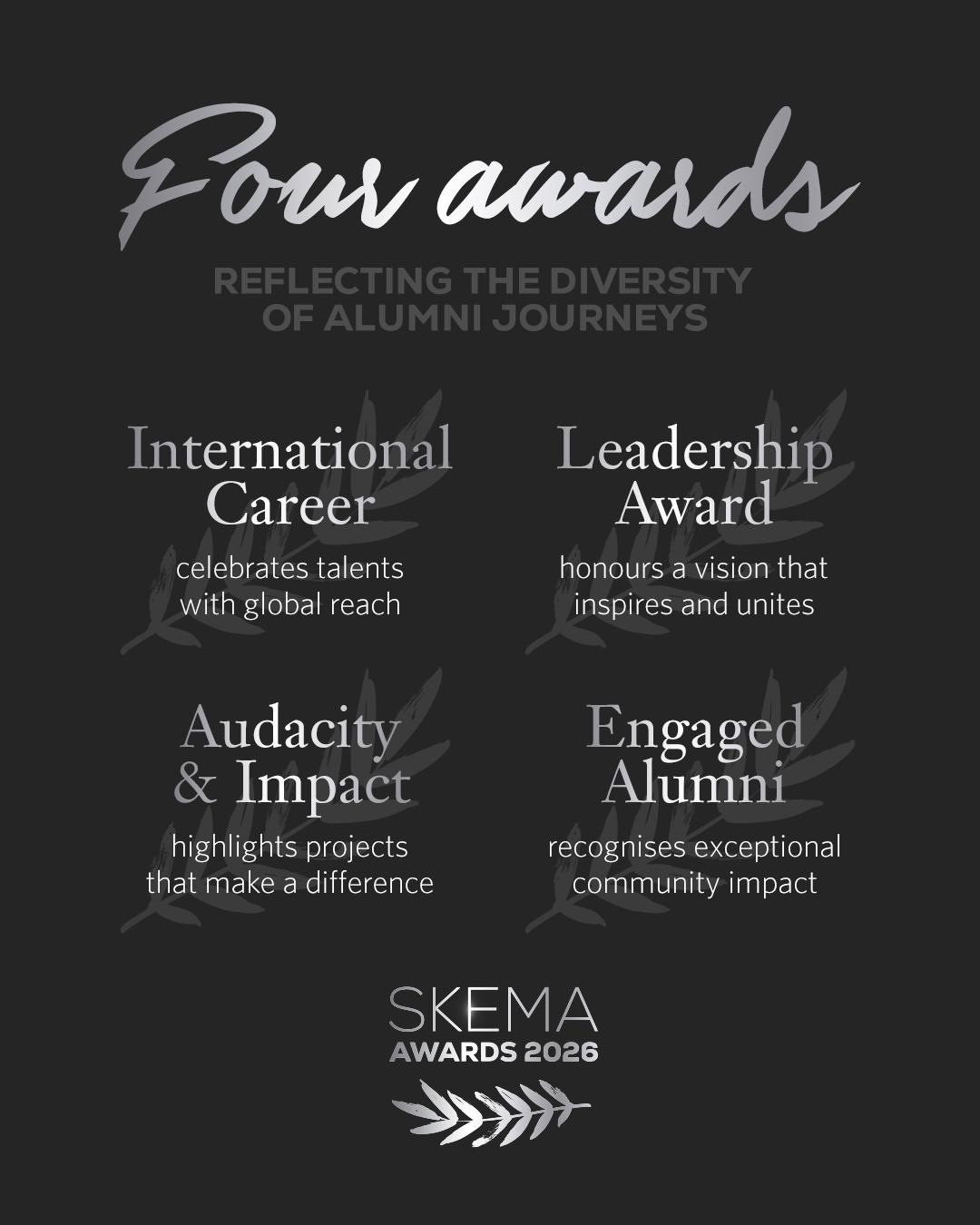 Que vous viviez en France, au Brésil, aux États-Unis, en Chine, aux Émirats ou ailleurs… que vous soyez dirigeant, expert, créateur, innovateur, intrapreneur ou engagé sur votre territoire : les SKEMA Awards sont votre moment.